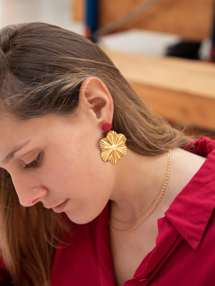 Toutes les puces textiles en teinture naturelle sont réalisées à l’atelier par la créatrice à partir de végétaux. Les couleurs peuvent légèrement différer des photographies et cela fait de votre bijoux une pièce unique.